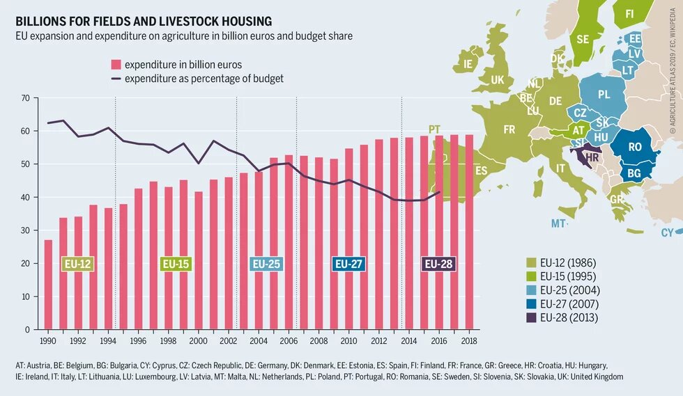 Agriculture currently accounts for 38 percent of the EU’s budget, or around 58 billion euros a year. In other words, every citizen pays 114 euros into the EU’s agriculture fund. Agriculture takes up the biggest chunk of the EU’s budget, though its share is shrinking. In 1988 it was 55 percent; by 2027 it should be only 27 percent.
