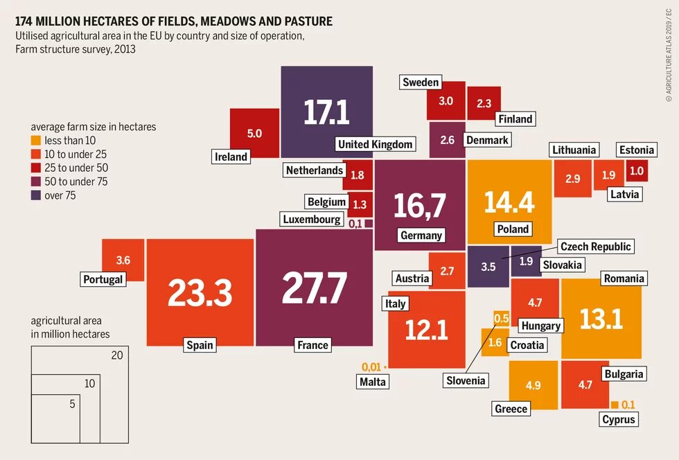 The land is divided into over ten million farms; one-third of them are located in Romania alone, and another 13 percent in Poland, followed by Italy and Spain. Farm sizes vary widely, from an average of a little over three hectares in Romania to 133 hectares in the Czech Republic. Farming’s contribution to the economy also varies from one country to another. In 2017, for the European Union as a whole, it accounted for 1.4 percent of the gross domestic product. It exceeded three percent in many of the new eastern member states of the EU, but reached between 0.5 and one percent in the older western member states.