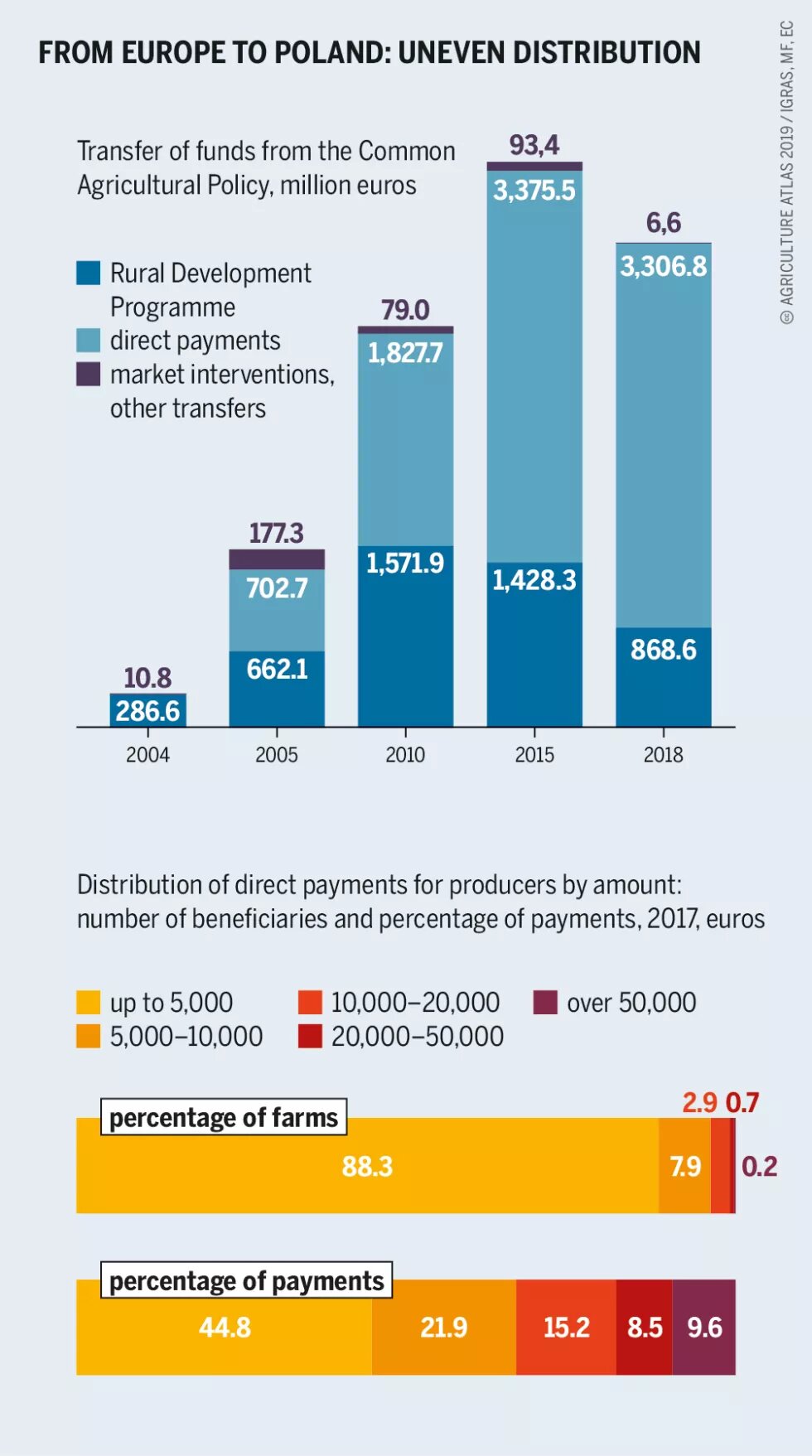 But success has taken its toll. Twenty-five years later, one farm in three has ceased to exist, and rural areas face depopulation: young people are abandoning the countryside in droves. Poland was the only EU country to reallocate the maximum amount (25 percent) of funds within the second pillar of the Common Agricultural Policy (dedicated to the modernization and development of rural areas) to direct payments. As a result, the biggest farms received most of the funds, and were able to invest in modernizing their production. Smaller farms did not get enough money to make these improvements; for them, the payments served more as social support.