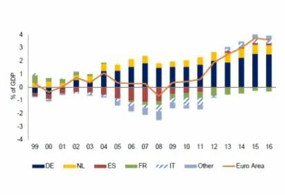 More than eight years since the outbreak of the global crisis and five years into the eurozone crisis the Union looks widely divided. Between 2010 and 2014, debtor and creditor countries alike have implemented ‘a massive contractionary shock – equal to four percentage points of the monetary union’s economy. The GIIPS [Greece, Ireland, Italy, Portugal and Spain] accounted for 48% of the fiscal swing, even though they accounted for only a third of EZ  GDP ..  EZ core nations decided that they too had to embrace fiscal rectitude. As the monetary union’s largest economy, tightening by Germany accounted for 32% of the Eurozone’s overall fiscal tightening. France’s austerity amounted to 13% of the EZ total.’ (CEPR 2015, p. 10-11). As a result of these austerity policies, only a few of the EZ nations have recovered their pre-crisis growth and employment rates (fig. 1), while socio-economic conditions in the periphery have worsened dramatically. With households, corporations and governments simultaneously reducing expenditure, income and production dropped and unemployment soared, with youth and long-term unemployment and inactivity rates at record heights. The destruction of physical, human and social capital occurred in this period will take years to redress. Meanwhile, the euro area is churning out the world's largest current account surplus in value terms (approximately 3.0% of GDP in 2015) (fig. 2). The bulk of it is accounted for by Germany (7.9% of GDP) and the Netherlands (10.6%), but also the former deficit countries are now recording balanced or surplus positions, reflecting the steep fall of their production and imports. In a context of enduring low growth in the core and deep recession in the periphery, the persistence of very high surpluses in core countries, far from denoting virtue, denounces ill-judged policies [1].
