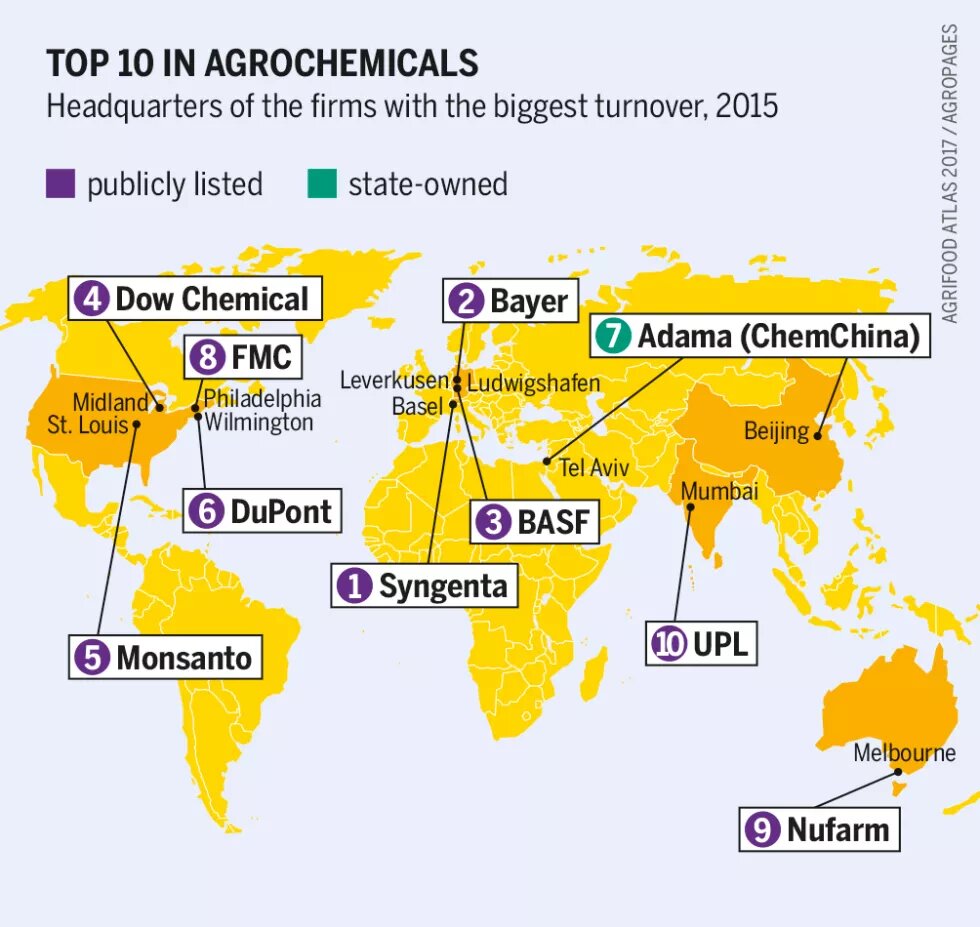 Other corporations want to benefit from the wave of mergers by buying up business segments that the merging companies have to sell off. US-based FMC, formerly known as Food Machinery and Chemicals Corporation, has benefited from the Dow-DuPont scraps, buying some of their pesticides and research departments, making them currently the 5th largest valued pesticide producer in the world. The German company BASF is also buying sell-offs from the mergers.