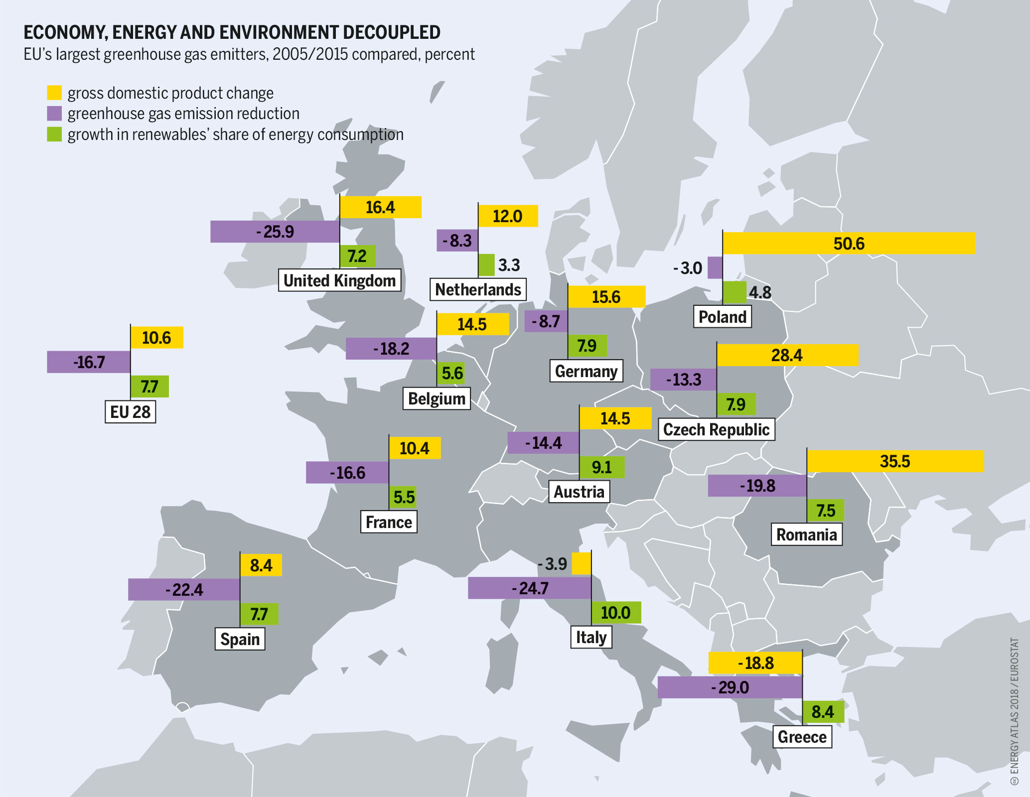 The rise of renewables has not slowed economic growth in Europe. Between 2006 and 2015, the European economy grew by a sluggish 0.7 percent while the share of renewables in final energy consumption grew by 7.7 percent. But the economy was held back by the global financial crisis of 2008–10, not by the growth in renewables. Since 2005, greenhouse gas emissions in Europe have fallen by 10 percent, and for the first time, the continent has seen a decoupling of its economic growth and greenhouse gas emissions. In essence, this is what the energy transformation can do: trigger economic prosperity while reducing the carbon footprint caused by burning fossil fuels. Renewables play a major role in driving this trend.