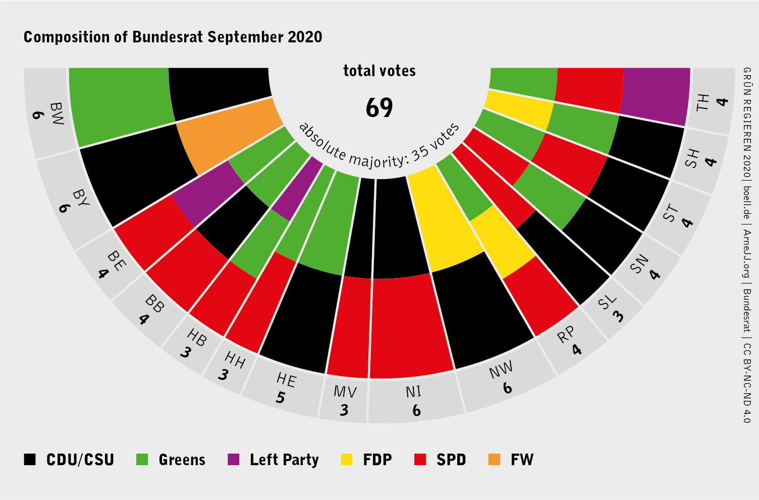 Through the Bundesrat, Alliance 90/The Greens influence federal legislation. They are involved in coalitions that control 45 of the 69 seats in the state chamber. The states without Green government participation command a total of 24 votes in the Bundesrat. For a 35-vote majority, therefore, the federal coalition of CDU/CSU and SPD must have at least three states with Green participation on its side with 11 votes.
