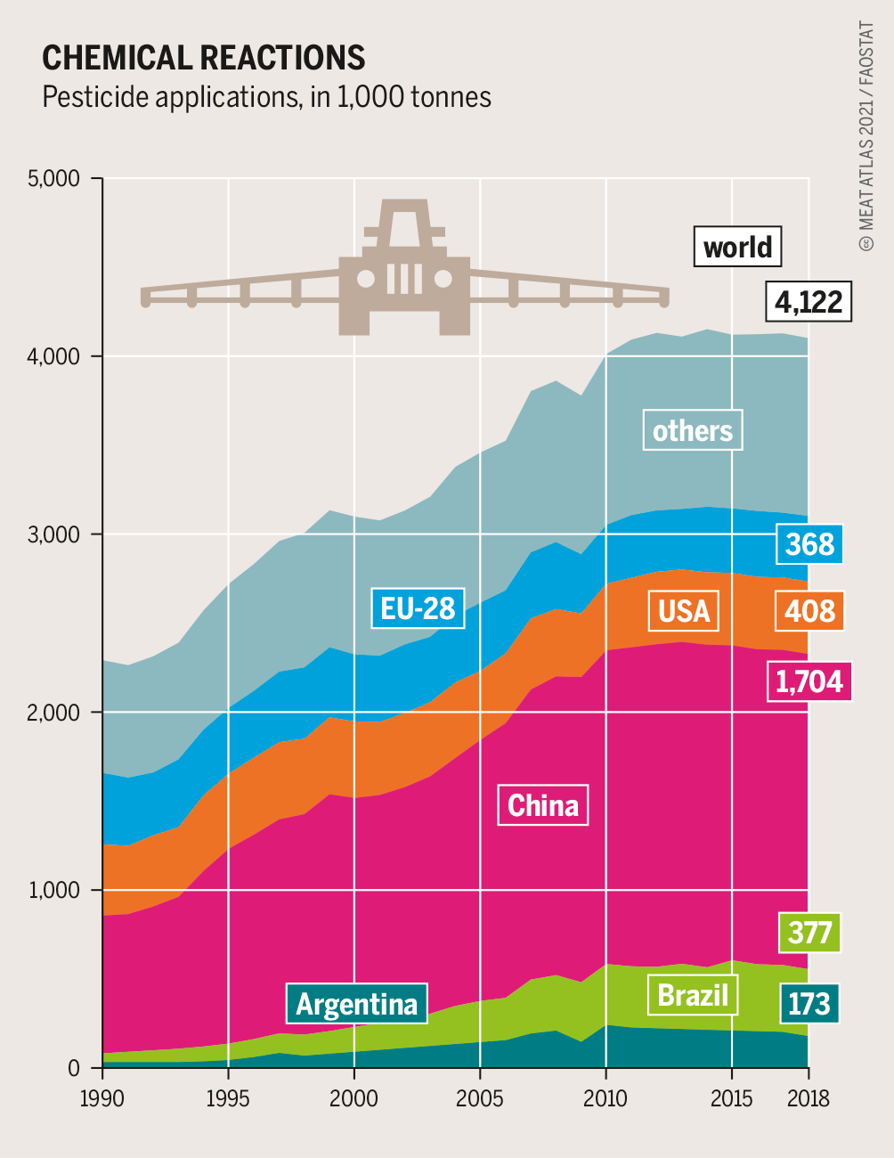 This increase results in part from the rising global demand for meat. This in turn stimulates the demand for protein-rich feed made from soybeans, the main producers of which are the USA, Brazil and Argentina. These three countries are among the world’s biggest pesticide users. The figures for China are contradictory. The country’s statistics office has given the Food and Agriculture Organization of the United Nations a figure of 1.7 million tonnes – over 40 percent of global consumption. But an official Chinese specialized authority reports just 300,000 tonnes. It is unclear if the two numbers can be compared. Regarding herbicides, which are used to control weeds, the USA uses more than 250,000 tonnes, Brazil nearly 230,000 tonnes, and Argentina 161,000 tonnes. Together, that is nearly 70 percent of the global reported consumption.