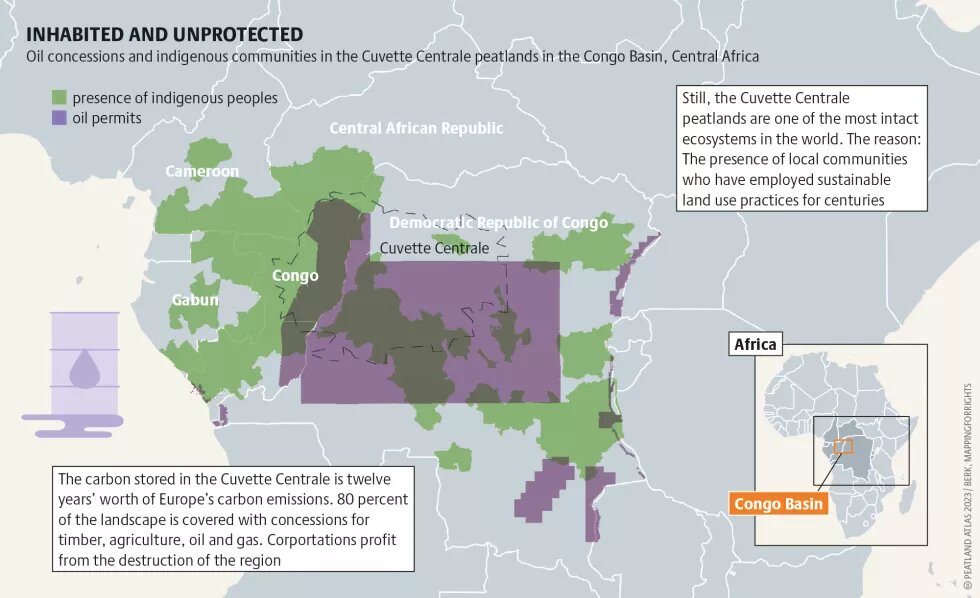 Despite its immense value, the Cuvette Centrale faces several threats. Expanding agricultural activities, oil and logging concessions, and infrastructure development pose significant risks to this fragile ecosystem. In November 2021, the government of the Democratic Republic of Congo signed a 10-year agreement to protect the Congo Basin forest, including its peatlands. But just a few months later, it announced its intention to auction off concessions for 27 oil and 3 gas exploration blocks. Several of the blocks overlap with the Cuvette Centrale peatlands. The results of the auction are expected in March 2024. In the meantime, a civil society-led campaign is trying to persuade oil companies not to bid for the concessions and is pressuring the government not to proceed with the auction.