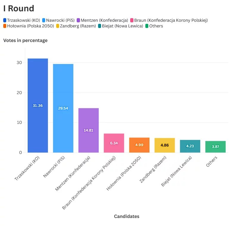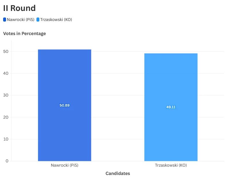The 2025 presidential elections in Poland were held, as usual, in two rounds, as none of the 13 eligible candidates achieved an absolute majority in the first round. The first round took place on May 18, 2025, with a turnout of 67.31%. Rafał Trzaskowski, was considered the favorite according to polls, started as the candidate of the Civic Coalition (KO), the party that currently leads the government, emerged as the frontrunner with 31.36% of the vote. He was closely followed by Karol Nawrocki, the candidate supported by the Law and Justice Party (PiS), who received 29.54% of the votes. Both advanced to the runoff election.