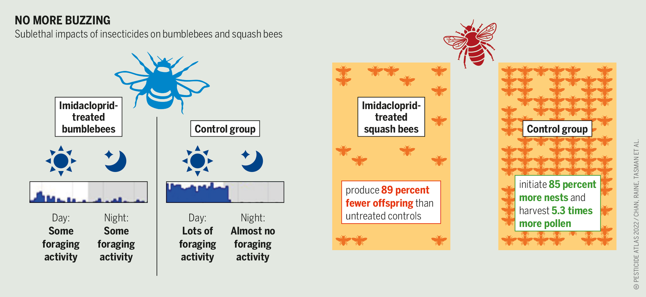 Systemic insecticides such as neonicotinoids contaminate soils and are taken up by the roots of wildflowers, so contaminating the nectar and pollen. Neonicotinoid insecticides have a range of sublethal impacts on bees, including impaired learning which interferes with communication and navigation; reduced immune function rendering them more susceptible to diseases; and reduced fecundity. A recent study found neonicotinoid insecticides in 75 percent of honey samples collected from around the world. Honey samples often contain not just neonicotinoids but a cocktail of ten or more pesticides, often including other insecticides, herbicides and fungicides. If honeybees are being exposed to these mixtures then it is very likely that thousands of other species of beneficial pollinating insects are also consuming them when they visit flowers. All these impacts are not taken into account enough in the regulatory process. Some negative impacts on pollinators are not even detected by regulatory studies. A progressive decline in insects threatens vital ecosystem services such as pollination, recycling, and biocontrol of pests, as well as removing a vital component of food webs, and ultimately endangers human wellbeing through the quality and quantity of our harvests.