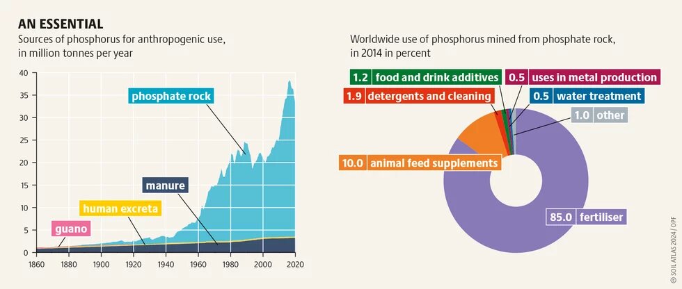 Phosphorus is bioessential, meaning that all living organisms require it. Yet, despite its presence in soils, it is a relatively rare element on Earth and is not always found in a form that plants can absorb. The fertiliser industry produces easily soluble phosphorus but depends on a finite, non-substitutable resource: phosphate rock.