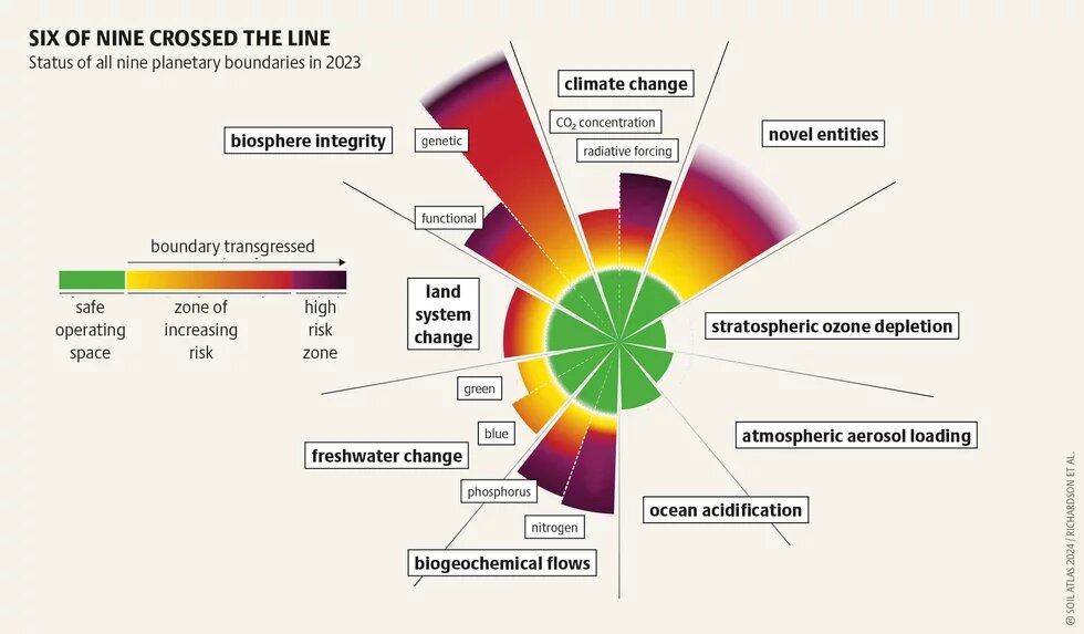 Although phosphate reserves are finite, phosphorus as an element does not deplete on Earth. Most mined phosphorus ends up in water bodies due to nutrient losses in the fertiliser value chain, and soil erosion, as well as through sewage systems. In aquatic ecosystems, phosphorus contributes to excessive growth of algae, which produces dead zones largely devoid of marine life. The planetary boundary for phosphorus has already been transgressed to a point where the environment can no longer self-regulate.