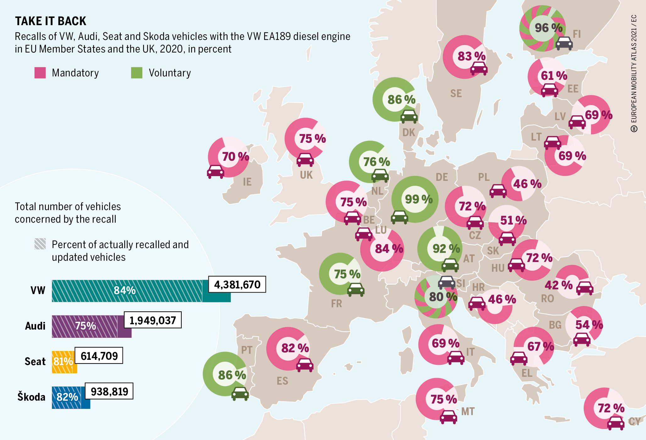 Sources for data and graphics: urbanaccessregulations.eu, https://bit.ly/34DrTqn; European Commission, State of play of the recall actions related to NOx emissions, https://bit.ly/37SYeeS; Umweltbundesamt, Reale Stickoxid-Emissionen von Diesel-Pkw nach wie vor zu hoch, https://bit.ly/3kFXUU2