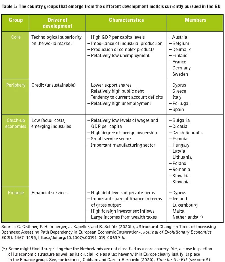 [4] See also J. Kapeller, C. Gräbner, and P. Heimberger (2019), Wirtschaftliche Polarisierung in Europa, Berlin: Friedrich-Ebert-Stiftung, https://www.fes.de/wirtschaftliche-polarisierung-in-europa; C. Gräbner, P. Heimberger, J. Kapeller, and B. Schütz (2020a), “Is the Eurozone Disintegrating? Macroeconomic Divergence, Structural Polarisation, Trade and Fragility”, Cambridge Journal of Economics 44(3): 647-669, https://doi.org/10.1093/cje/bez059; C. Gräbner and J. Hafele (2020), The Emergence of Core-periphery Structures in the European Union: A Complexity Perspective (ZOE Discussion Papers 6), Bonn: ZOE, https://zoe-institut.de/wp-content/uploads/2020/09/zoe-dp6-graebner-hafele-core-periphery.pdf.