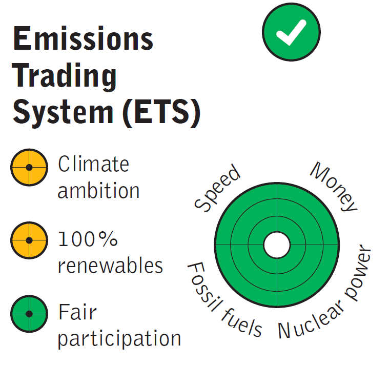 The ETS sets a gradually decreasing cap on the emissions from heat and electricity generation, industry, aviation and maritime transport. The polluters have to pay for their emissions by buying (and/or trading) emission allowances. The ETS is further complemented by the ETS2 dealing with emissions from fuels, transport and buildings and the Carbon Border Adjustment Mechanism (see dedicated scorecards).